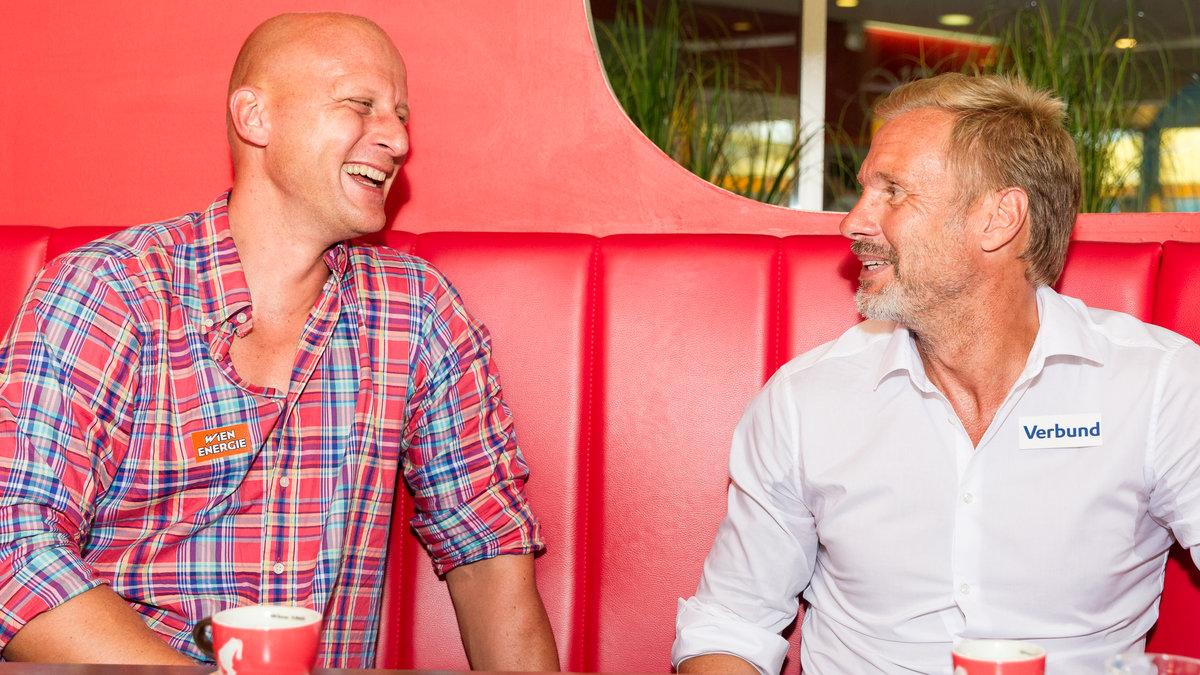 Haben Sie Wien schon von oben gesehen? Austria-Trainer Thorsten Fink schon. Immerhin wohnt er im Melia Hotel im DC Tower, dem höchsten Gebäude Wiens. Für den KURIER-Termin ging er aber gemeinsam mit Rapid-Co-Trainer Carsten Jancker im Wiener Riesenrad in die Luft und freute sich sichtlich, seinen Spezi aus Münchner Zeiten wiederzusehen. Zum ersten Mal in Wien. Die Riesenrad-Betreiber hielten für die früheren Bayern-Spieler und Champions-League-Sieger den Kaffeehaus-Waggon frei.