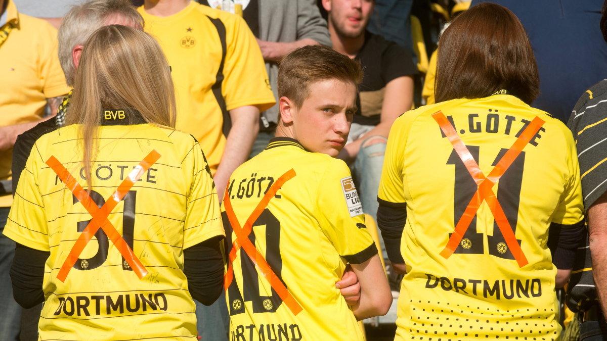 © APA/BERND THISSENepa03687390 Borussia Dortmund fans wear jerseys with the crossed-out number of Mario Goetze during the German Bundesliga soccer match between Borussia Dortmund and Bayern Munich in Dortmund, Germany, 04 May 2013. Borussia Dortmund forward Mario Goetze will join Bundesliga rivals Bayern Munich at the end of the 2012-13 season.