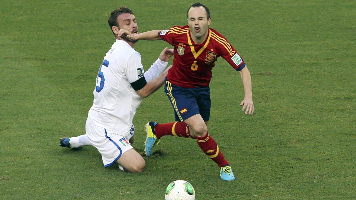 © Reuters/PAULO WHITAKERSpain's Andres Iniesta (R) is knocked off the the ball by Italy's Daniele De Rossi during their Confederations Cup semi-final soccer match at the Estadio Castelao in Fortaleza June 27, 2013. REUTERS/Paulo Whitaker (BRAZIL - Tags: SPORT SOCCER)