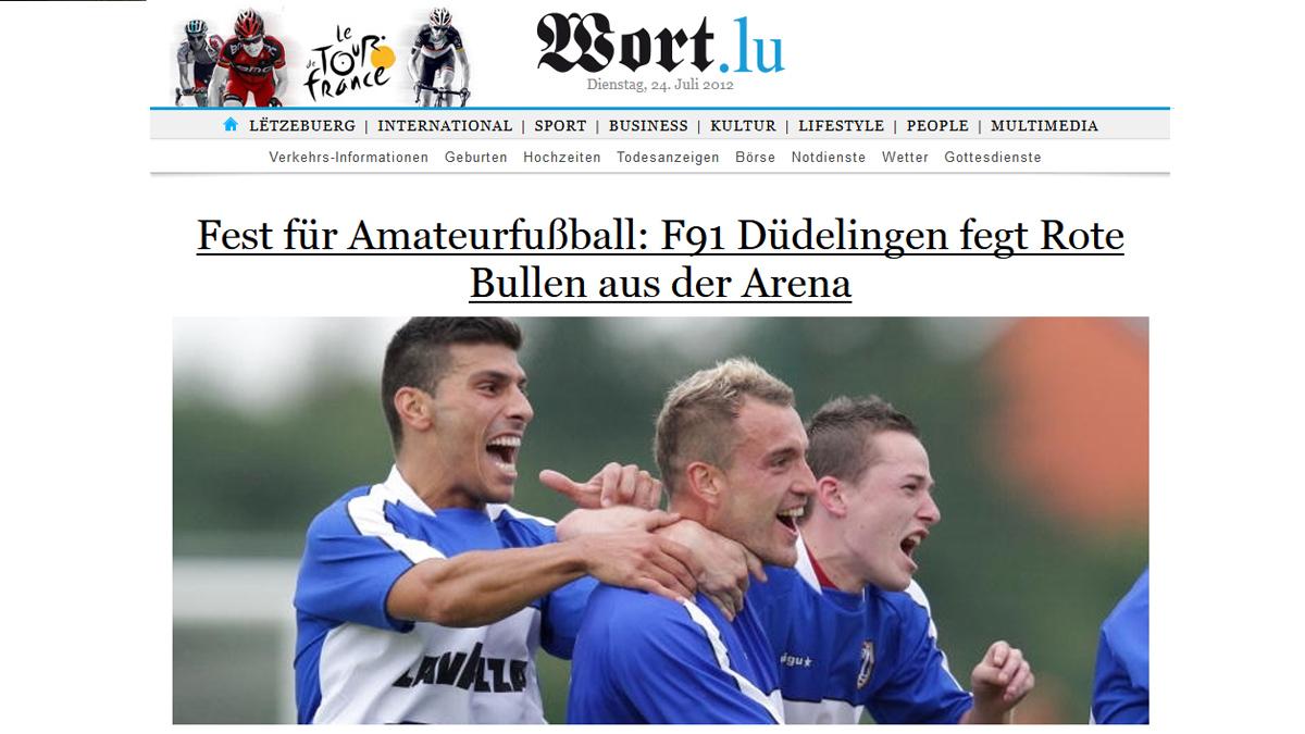sueddeutsche.de: "Salzburg blamiert sich gegen Düdelingen Luxemburg feiert Düdelingen: Der kleine Verein F91 hat Red Bull Salzburg in der Qualifikation zur Fußball-Champions-League aus dem Wettbewerb geworfen."