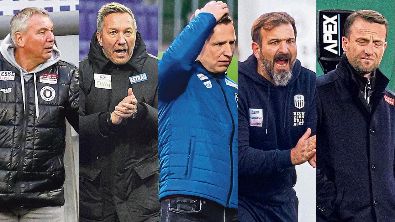 Moderner Fünfkampf: Peter Pacult (Klagenfurt), Manfred Schmid (Austria), Robert Ibertsberger (Ried), Andreas Wieland (LASK) und Ferdinand Feldhofer (Rapid)