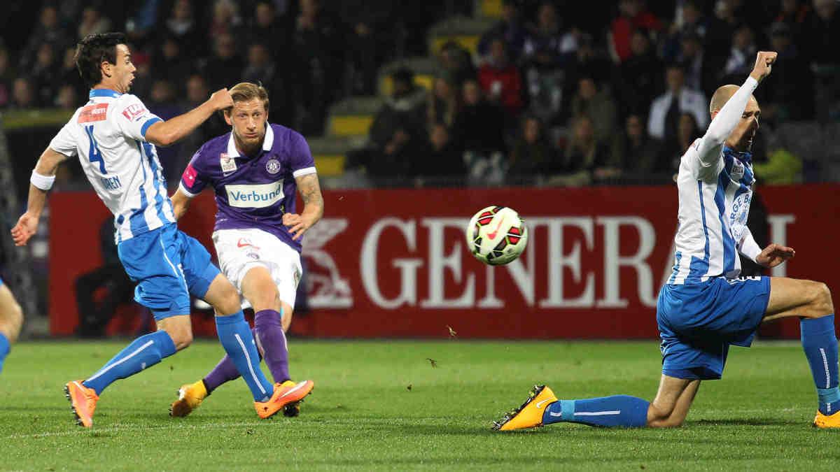 Die treuen Anwesenden durften schon nach zwölf Minuten eifrig in die Hände klatschen: Daniel Royer setzte die anfängliche Überlegenheit und das sichtbare Bemühen der Wiener in Zählbares um und traf mit einem Schuss ins lange Eck zum 1:0. Da war sie also, die von allen Veilchen so herbeigesehnte Führung, mit der alles viel leichter vom Fuß gehen sollte.