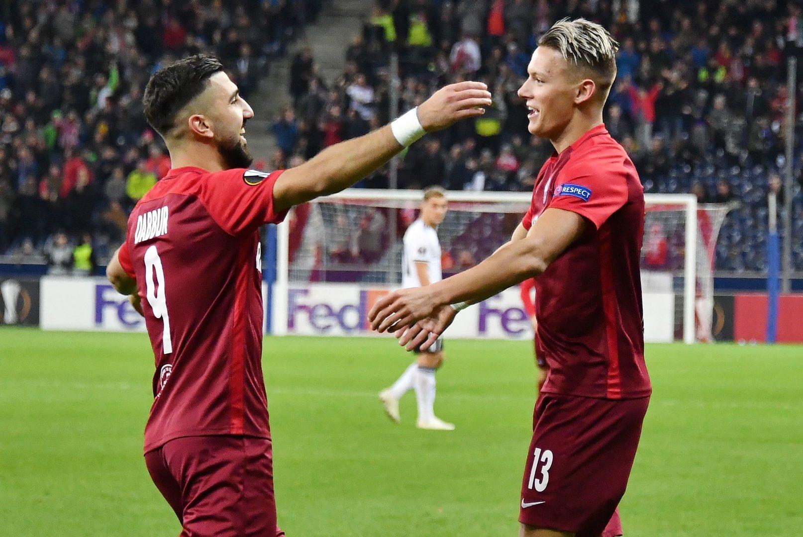 Eine Salzburger Führung war nur eine Frage der Zeit, auch weil die Gäste im Aufbauspiel extrem viele Fehler begingen. Nach so einem fiel auch das 1:0: Haidara kam an den Ball, spielte den freistehenden Lainer an. Dessen Flanke erwischte Gulbrandsen per Kopf zunächst nicht richtig, der dahinter stehende Dabbur umso besser. Der Israeli erzielte per Kopf seinen vierten Treffer in dieser Europa-League-Saison (34.).