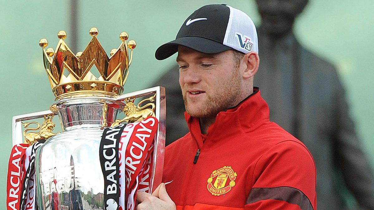 epa03699056 Manchester United's Wayne Rooney carries the English Premier League trophy during an open top bus parade through Manchester, Britain, 13 May 2013. The team of Manchester United celebrated their 20th Premier League title win with thousands of fans during a victory parade around the streets of Manchester. EPA/PETER POWELL
