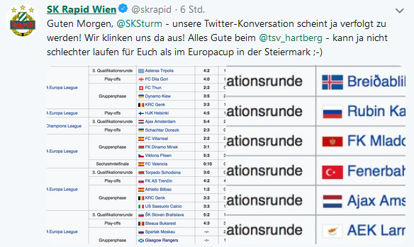 "Guten Guten Morgen, SK Sturm - unsere Twitter-Konversation scheint ja verfolgt zu werden! Wir klinken uns da aus! Alles Gute beim TSV Hartberg - kann ja nicht schlechter laufen für Euch als im Europacup in der Steiermark", heißt es in dem Tweet am Donnerstagmorgen. Beigefügt - die Wikipedia-Bilanzen der beiden Klubs im Europacup der letzten Jahre.