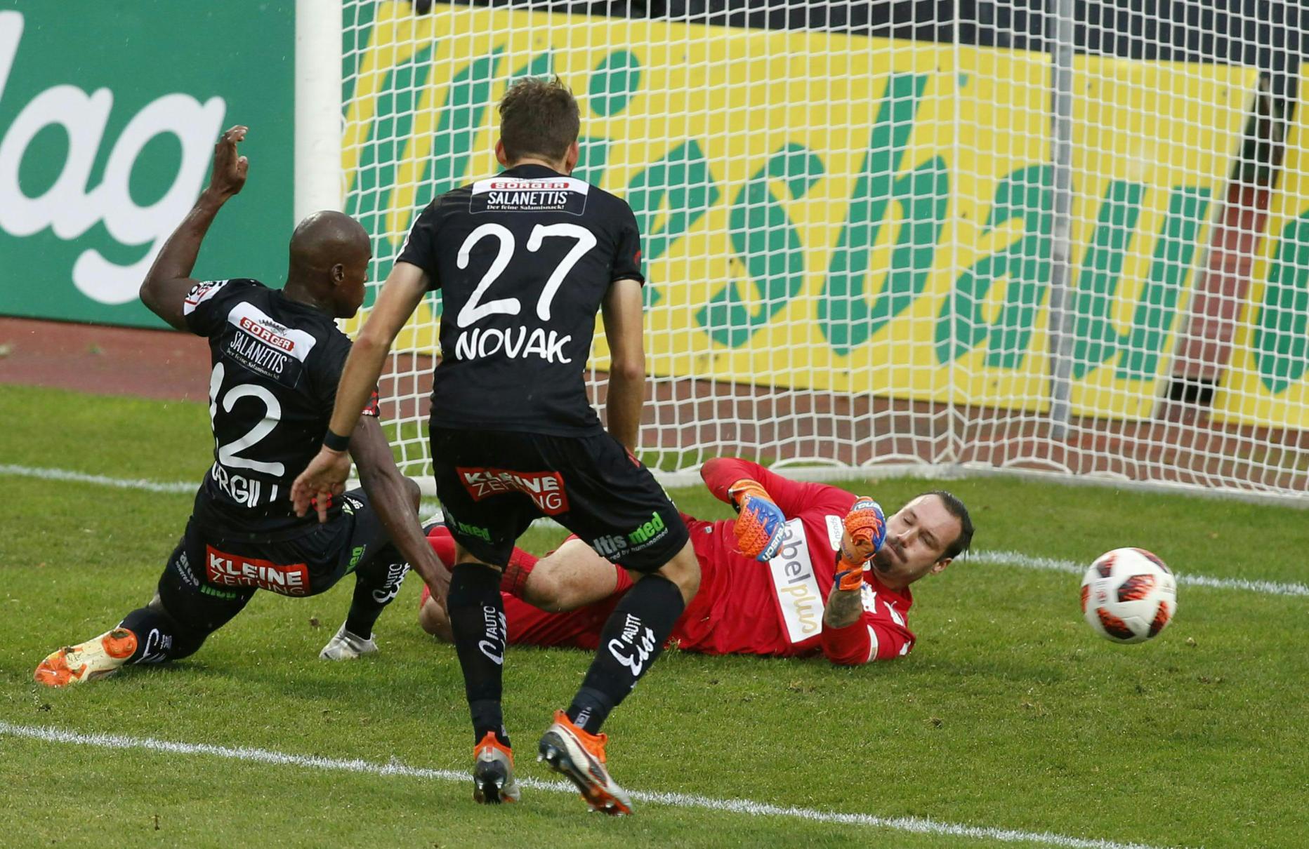 Dazwischen setzte Mario Leitgeb nach einem Corner noch einen wuchtigen Kopfball an die Latte (11.). Nach einem abgefälschten Versuch von Schmerböck rettete Riegler vor dem einschussbereiten Orgill (18.). Im Lauf des Spiels setzte Regen ein, die wankenden St. Pöltner erfingen sich etwas. Pak Kwang-ryong prüfte mit einem Fernschuss Alexander Kofler (39.), auch Taxiarchis Fountas klopfte beim WAC-Torhüter an (44.).