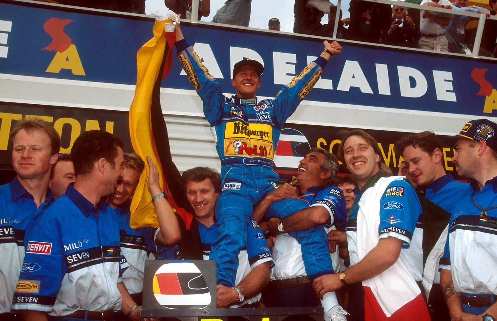 Am 13. November 1994 ging der Deutsche in Australien mit nur einem WM-Punkt Vorsprung auf Damon Hill ins letzte Saisonrennen. In der 36. Runde rutschte Schumacher in Adelaide von der Strecke, blieb aber knapp vor Hill. In der nächsten Rechtskurve versuchte Hill, innen vorbeizukommen, der Deutsche blieb auf der Ideallinie. Die Wagen berührten einander, Schumacher flog über Hills Vorderrad und landete im Reifenstapel. Hill fuhr noch an die Box, eine Radaufhängung war gebrochen. Hill gab das Rennen auf, Schumacher war Weltmeister.