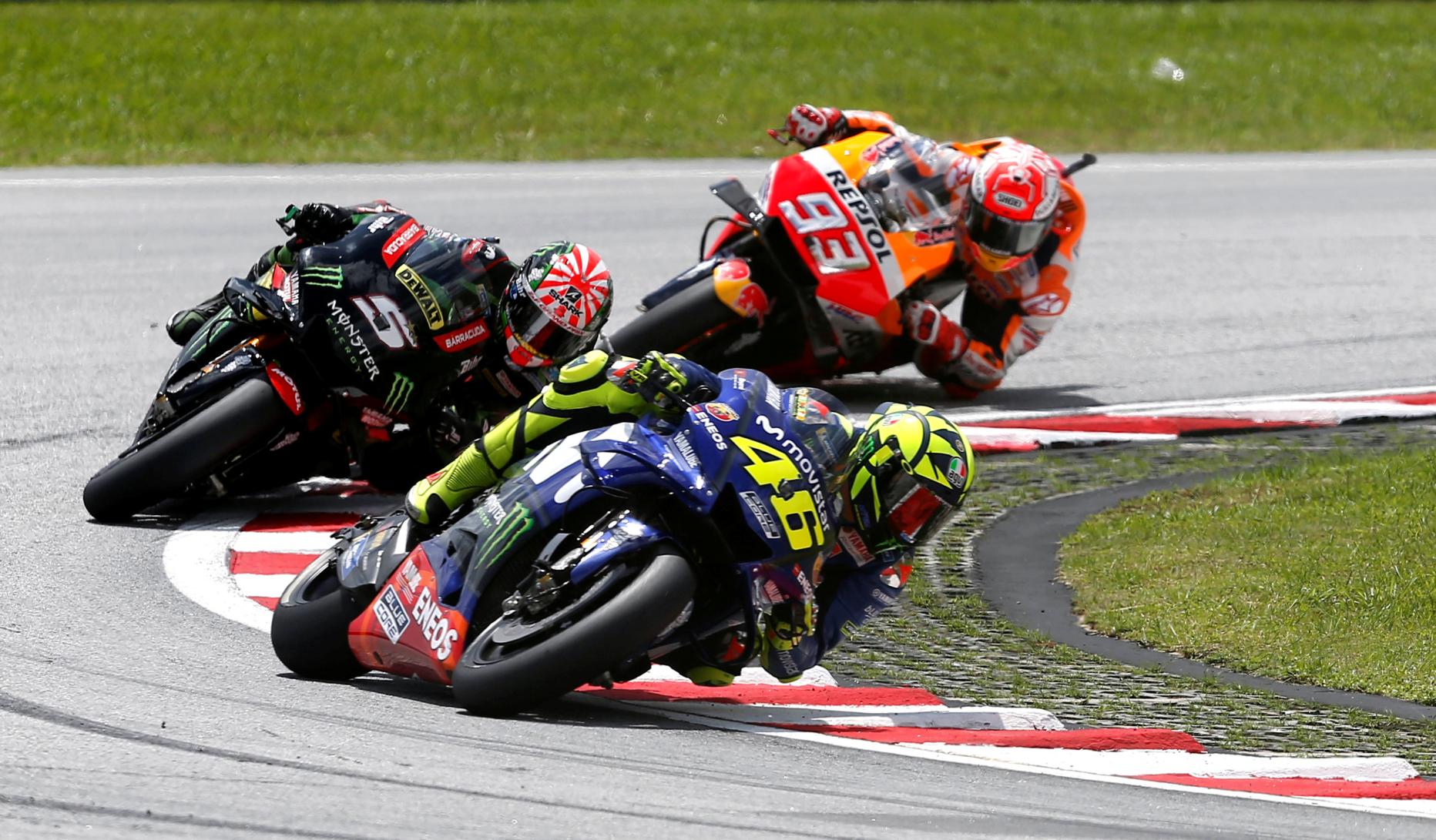 MotoGP-Superstar Marc Marquez hat seinen 70. Sieg in der Motorrad-Weltmeisterschaft gefeiert - unter tatkräftiger Mithilfe von Altmeister Valentino Rossi, der beim Großen Preis von Malaysia vier Runden vor Schluss in Führung liegend stürzte. Die weiteren Podiumsplätze belegten Suzuki-Pilot Alex Rins und Yamha-Privatier Johann Zarco, der nach der Strafe gegen Marquez von Platz eins ins Rennen gegangen war.