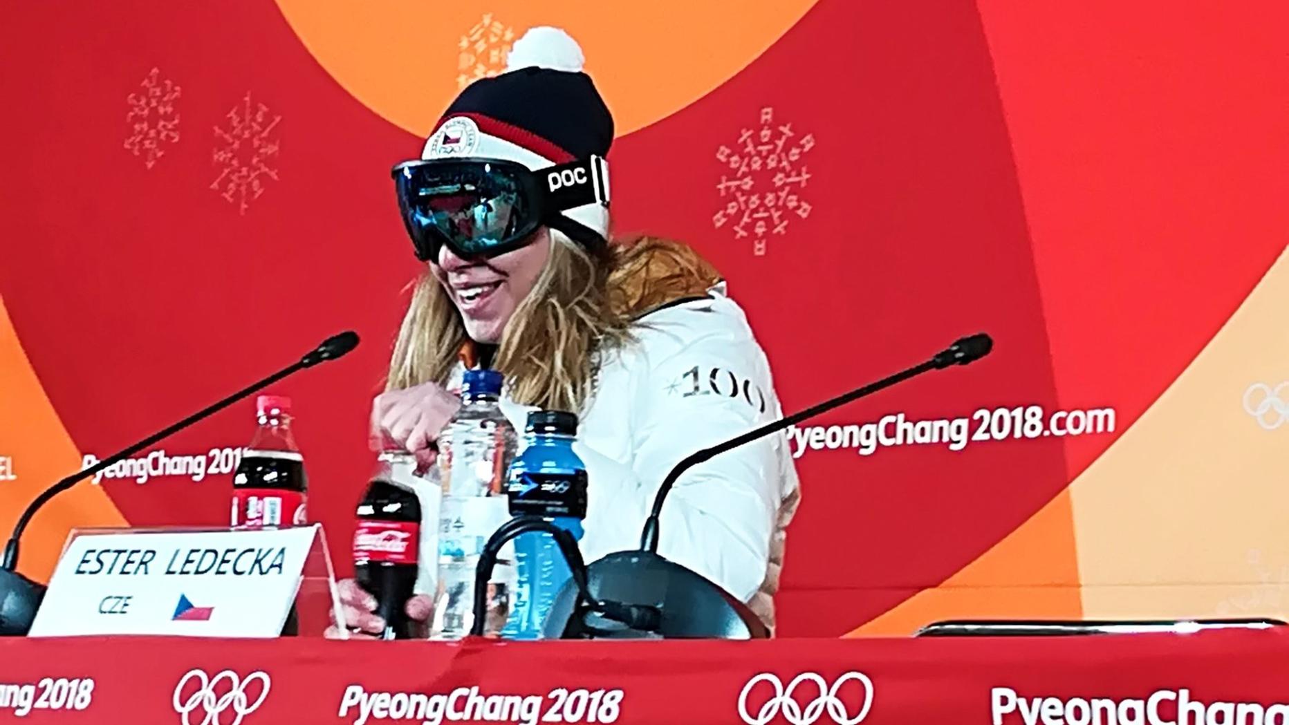 Die Super-G-Sensationssiegerin Ester Ledecka sorgte nicht nur bei ihrem Triumph, sondern auch bei der Sieger-Pressekonferenz in Jongseon für Staunen. Die 22-Jährige tauchte vor den versammelten Medienleuten mit einer Skibrille auf dem Kopf. So stellte sie sich dann auch den Fragen.