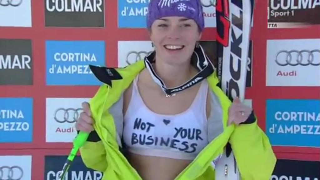 Tina Maze hat gerade ihren Super-G-Lauf hinter sich gebracht und liegt in Führung. Auf einmal öffnet die Slowenin den Rennanzug und zeigt ihren BH in die Kameras. "Not Your Business" ("Das geht euch nichts an") steht darauf geschrieben.