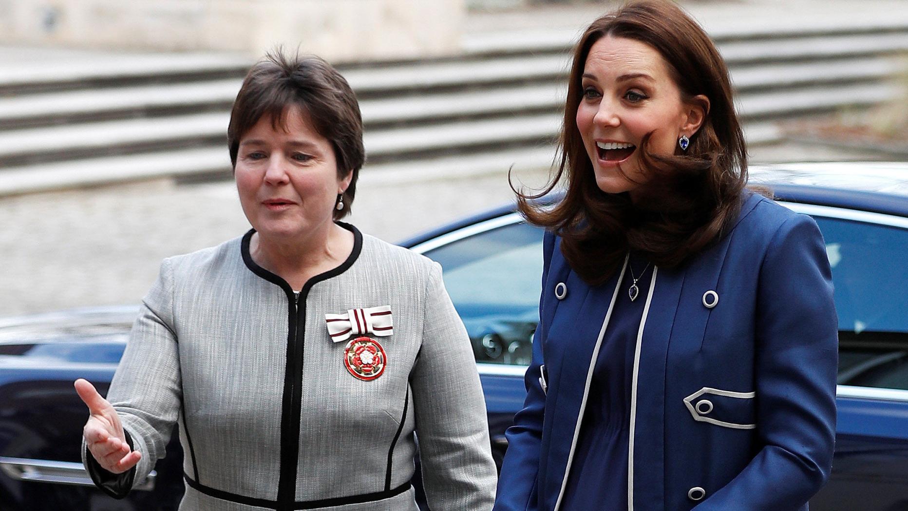 Kate präsentierte sich bei dem Termin in einer blauen Kombination aus Kleid und Mantel von Jenny Packham, unter dem sich bereits ein stattlicher Babybauch wölbte und gab sich bester Laune.