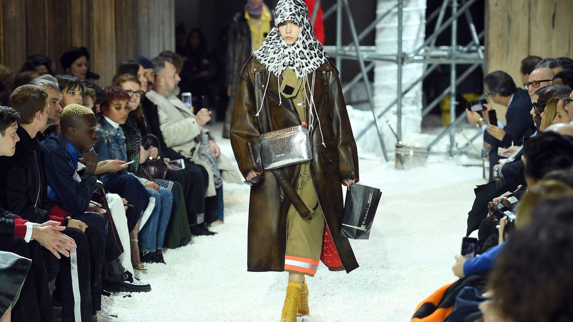 Als die Show schließlich startete, liefen die Models in ihren High Heels und Stiefeln über den komplett mit Lebensmitteln ausstaffierten Laufsteg, als ob dieser mit Schnee bedeckt wäre. Einige wurden für die Präsentation der teils von der Raumfahrt und Cowboys inspirierten Mode mit Popcorn-Tüten als Accessoires ausgestattet.