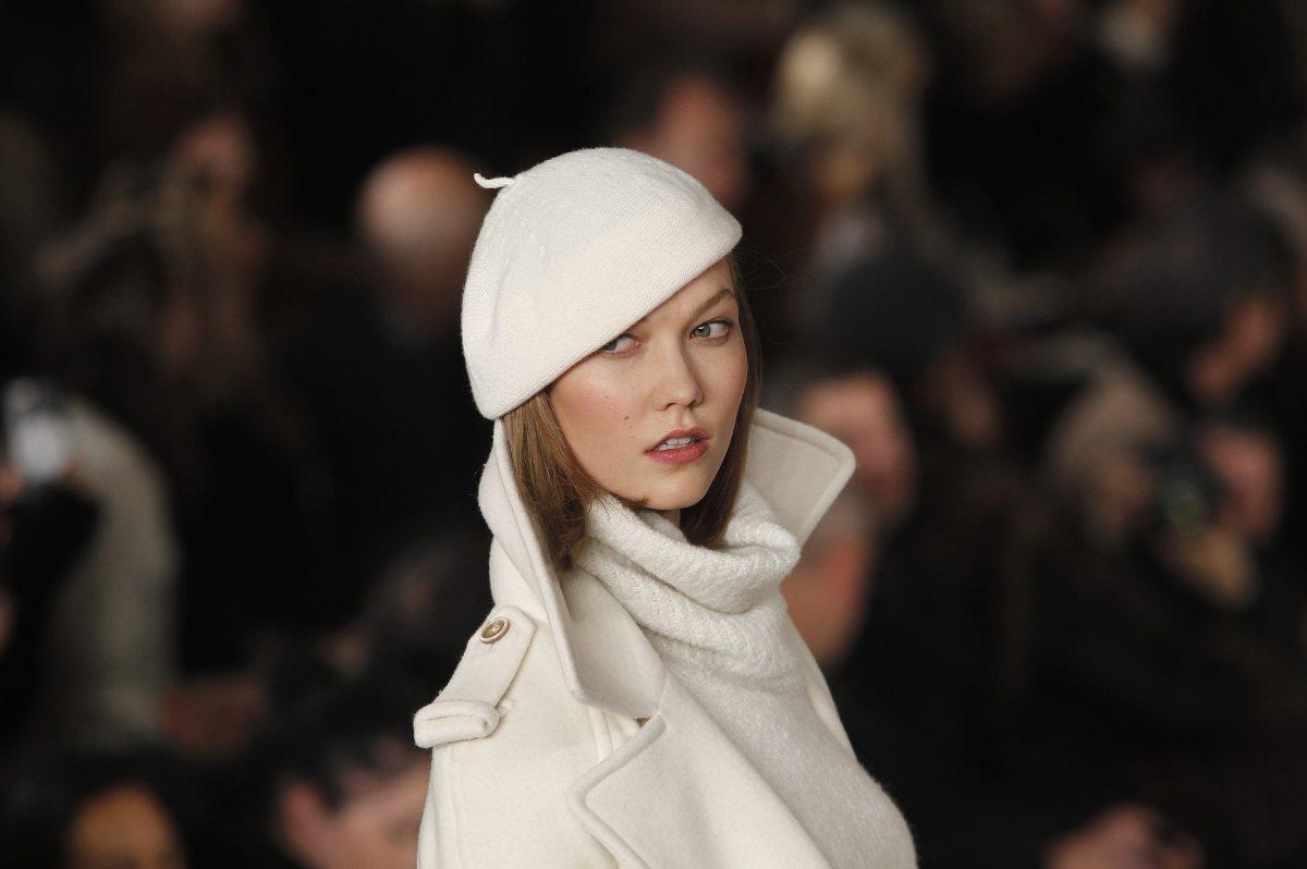 Schneeprinzessin: Supermodel Karlie Kloss trägt einen reinweißen Strickpulli unter einem cremefarbenen Mantel von Ralph Lauren. Auch ein wärmender Herbsttrend: Rollkragen.