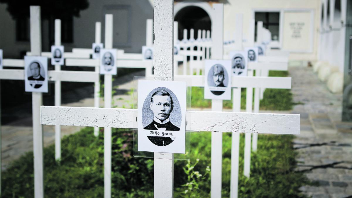Ende Dezember 1914 zählte die Monarchie 1,8 Millionen Opfer (Tote, Verwundete, Gefangene), insgesamt kamen im Ersten Weltkrieg rund 18 Millionen Menschen ums Leben. An den "Heldentod" erinnern symbolhaft die Kreuze im Garten des Palais Porcia.