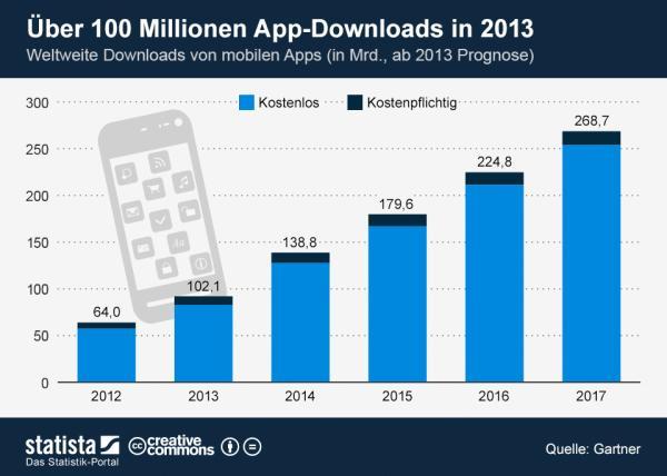 intGartner errechnete, dass 2013 über App-Stores weltweit Apps mittels 102 Milliarden Downloads abgesetzt werden. Dieses Transaktionsvolumen wüchse innerhalb eines Jahres von 64 Milliarden Downloads. Davon entfallen 91 Prozent auf Free- und neun Prozent auf Paid-Downloads. Der mit diesem App-Download-Volumen lukrierbare Umsatz im Jahr 2013 wird von Gartner auf 26 Milliarden nach 18 Milliarden US-Dollar im Jahr 2012 beziffert.