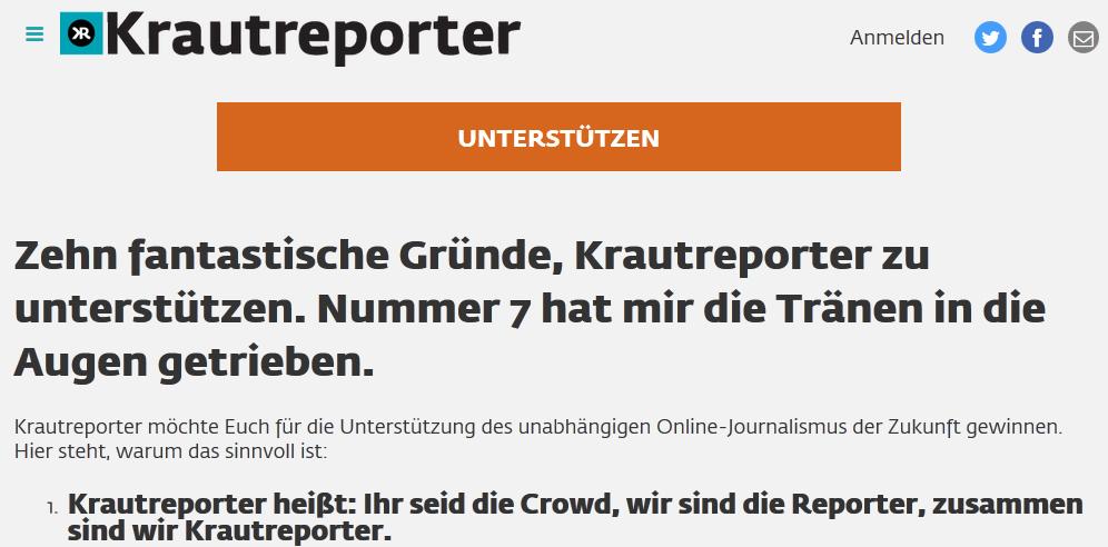 Eine mögliche Antwort auf die Frage, wie man denn im Zeitalter des Internet ein Medium völlig neu gründen könnte, ohne, dass es sich auf Katzenfotos und nackte Haut spezialisiert, hat das deutsche Kollektiv Krautreporter gefunden. Der Name ist ein Wortspiel aus "Kraut" (englische Negativ-Bezeichnung für Deutsche), "Crowd" (sprich: Kraut) und Reporter. Wobei der "Crowd" die Finanzierung zukommt, damit die Journalisten frei von jeglichen Erlöszwängen auf dem Werbemarkt schreiben können.