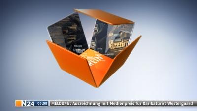 deN24 geht mit neuem On-Air-Design auf Sendung. Kern dieser Optimierung ist die Erweiterung des orangefarbenen Wort-Bild-Marken-Würfels. Dessen Farbwelt wurde um einen hellblauen Bereich erweitert.