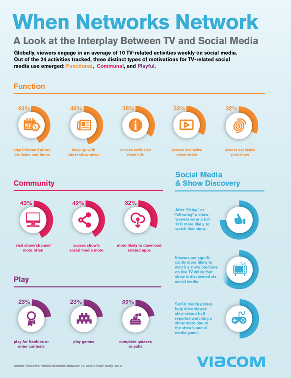 intDie Beziehung zwischen der Fernseh- und der Social-Media-Nutzung wird enger. Soziale Medien und deren Interaktionsformen drängen und erobern sich die bislang noch als durchaus ungeteilt definierte Aufmerksamkeit von Zuschauern vor den TV-Geräten. Viacom Media Networks liefert dazu eine Studie, deren Ziel es war, wie Colleen Fahey Rush, Executive Vice President und Chief Research Officer, erklärt, "nicht nur zu verstehen, warum unser Publikum Social Media nutzt, sondern um zu sehen, wie sich ihre diesbezüglichen Aktivitäten auf ihr TV-Nutzungsverhalten auswirkt".