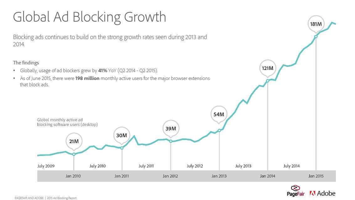 -Weltweitsteigt die Zahl der Ad Blocking-Nutzer innerhalb eines Jahres von Q2 2014 bis Q2 2015 um 41 Prozent auf 198 Millionen Monthly Active Users.