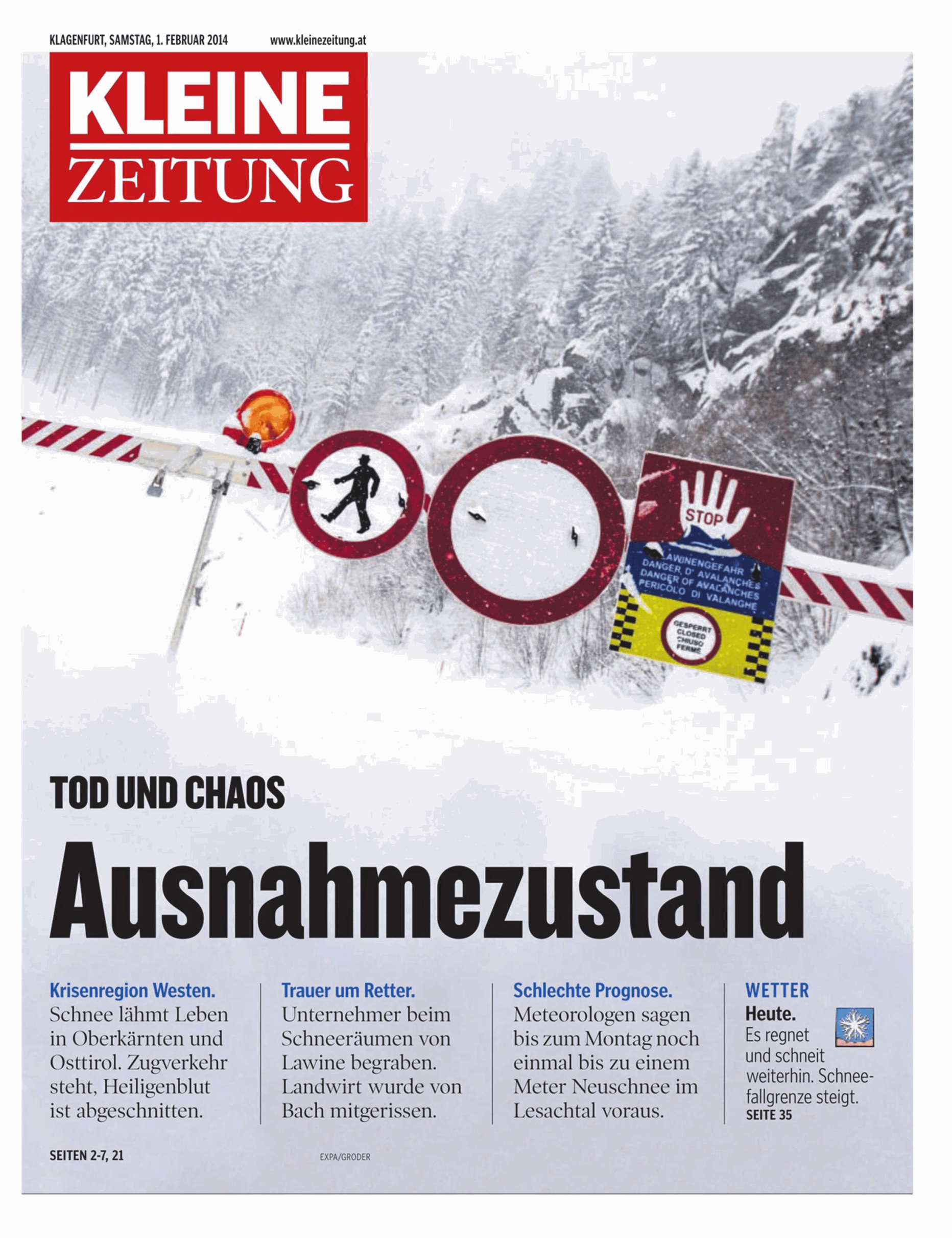 infoSchlagzeile vom 01.02.2014AusnahmezustandKleine Zeitung Kärntenkleinezeitung.at Wirtschaft atmedia Titelseiten vom 01.02.2014 01/31/2014, 11:00 PM Kommentare Teilen | 01/31/2014, 11:00 PM
