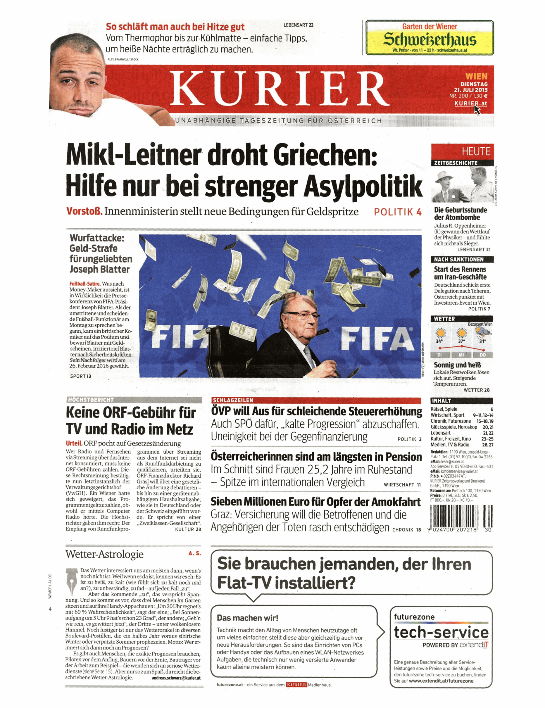 infoSchlagzeile vom 21.07.2015Mikl-Leitner droht Griechen: Hilfe nur bei strenger AsylpolitikKurierkurier.at Wirtschaft atmedia Titelseiten vom 21.07.2015 07/20/2015, 10:00 PM Kommentare Teilen ( kurier.at ) | 07/20/2015, 10:00 PM