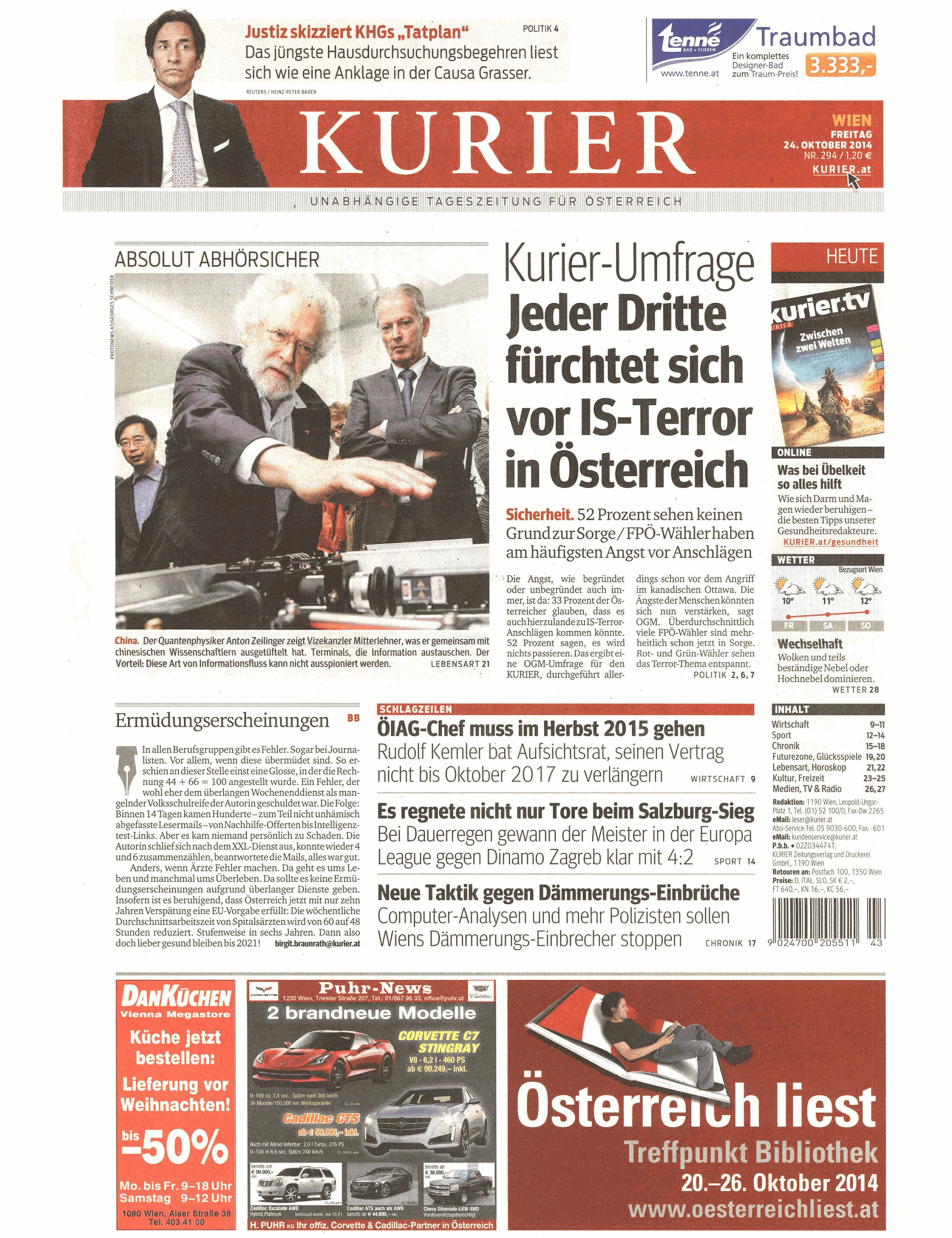 infoSchlagzeile vom 24.10.2014Jeder Dritte fürchtet sich vor IS-Terror in ÖsterreichKurierkurier.at Wirtschaft atmedia Titelseiten vom 24.10.2014 10/23/2014, 10:00 PM Kommentare Teilen | 10/23/2014, 10:00 PM