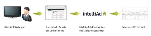 Das Unternehmen legt diesem TV-Tracking einen Algorithmus zur Berechnung des Einflusses sekundengenauer Sendezeiten auf die verschiedenen Online-Kanäle zugrunde. intelliAd nimmt für sich in Anspruch, dass dieses eigene Tracking nicht nur Klick- und Conversion-Ergebnisse liefert sondern auch Umsatz und ROI pro TV-Spot und Sendezeit zu liefern im Stande ist.