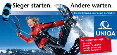 "Schild steht für eine Sportlerin der neuen Generation, die getreu dem Kampagnenmotto zeigt, dass Sieger starten, swenn andere warten", erklärt Carl Gabriel, Uniqa-Marketingleiter. Und "neue Generation" ist eine Schlüsselbegriff für das Finanzdienstleistungsunternehmen. Uniqa versteht sich, wie Gabriel erklärt, als "Versicherung einer neuen Generation für Versicherungskunden neuer Generation". Diese wollen "zeitgemäße Produkte" und kümmern sich "aktiv um ihrer Vorsorge". Wodurch sich der eingangs angeführte Claim bestätigen läßt. Schild wird von der, die Kampagne realisierenden Agentur Springer & Jacoby Österreich nicht beim Alpin-Skifahren sondern beim Snowkiting gezeigt.