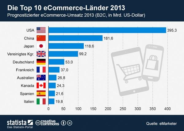 intMit knapp 400 Milliarden US-Dollar E-Commerce-Umsatz im Jahr 2013 ist die USA der größte und dominierende Markt für digitalen Handel. Selbst die beiden danach folgenden Märkte China und Japan werden heuer nicht gemeinsam an das US-Commerce-Volumen herankommen. Allerdings stammt diese Prognose und die Reihung der zehn größten Online-Handelsmärkte der Welt aus den USA. Deutschland wird hier auf mit 53,0 Millarden Dollar auf dem fünften Platz geführt und ist halb so umsatz-schwer wie der davor gereihte britische E-Commerce-Markt.