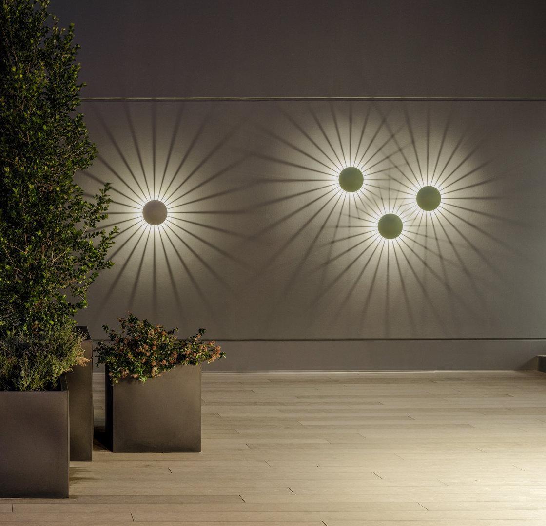 Das spanische Designerduo Jordi Vilardell und Meritxell Vidal kreieren mit ihrer neuen Outdoor-Leuchte für Vibia eine ähnliche Stimmung. Mit „Meridiano“ vereinen sie Material und Licht in einem Entwurf und malen ein Kunstwerk an die Hausmauer, das an den heißen Tag im Sommer 1999 erinnert.