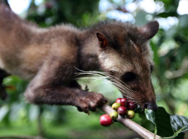 epa02285274 A civet eats coffee from a branch at a farm in Liwa, West Lampung District, Indonesia, on 13 August 2010. Kopi Luwak, a coffee variety, is made from hard beans that have been eaten by civets and then fermented in their stomachs before being excreted and roasted. It's highly prized for its smooth flavor and bitterless aftertaste, sometimes fetching well over $200 a pound ($440 per kilogram) online. EPA/BAGUS INDAHONO