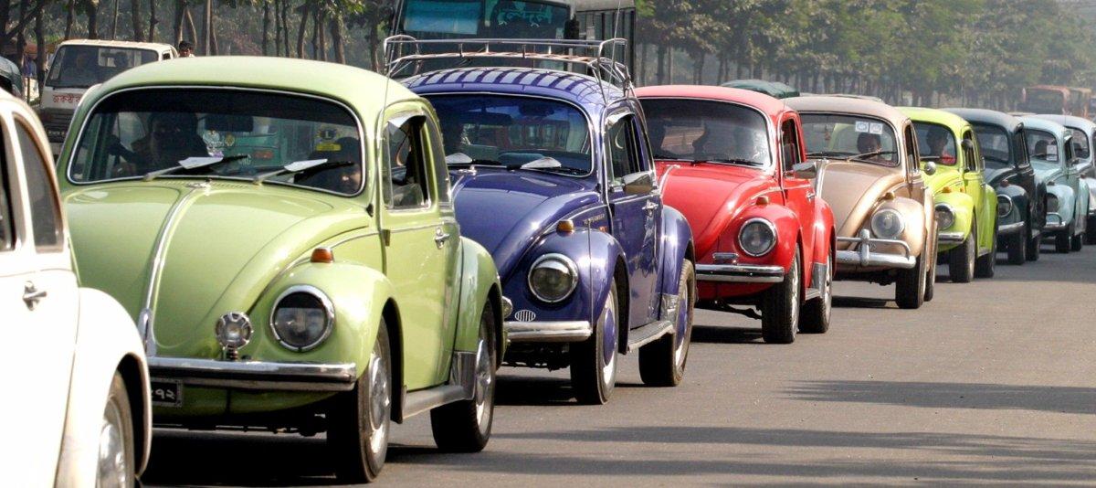 Volkswagen cars move while in a queue on a Dhaka street, December 9, 2005. Some 30 old 1960's model Volkswagen cars began a 100 km (62 miles) journey on Friday on the sixth rally organised by the Volkswagen Club of Bangladesh. The organisers want to preserve these cars as antiques for the future generation as the model of these cars ceased production several years ago. REUTERS/Rafiqur Rahman
