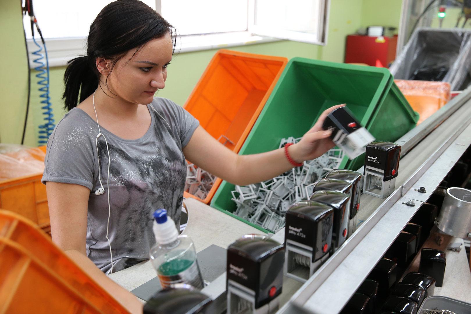 „Grün“ ist der Printy deshalb, weil er zu 70 Prozent als Kunststoff-Recyclingmaterial hergestellt wird und daher das Logo „-neutral“ tragen darf. Rund 35 Millionen Stück von Printy und ein Dutzend anderer Stempel-Modelle laufen pro Jahr vom Band der Trodat-Fabrik mitten in Wels/ Oberösterreich. Der aus Deutschland angelieferte Kautschuk wird geschnitten, der Kunststoff erhitzt in die richtige Form gebracht. Dann erledigen Maschinen die Fertigstellung des Stempels.