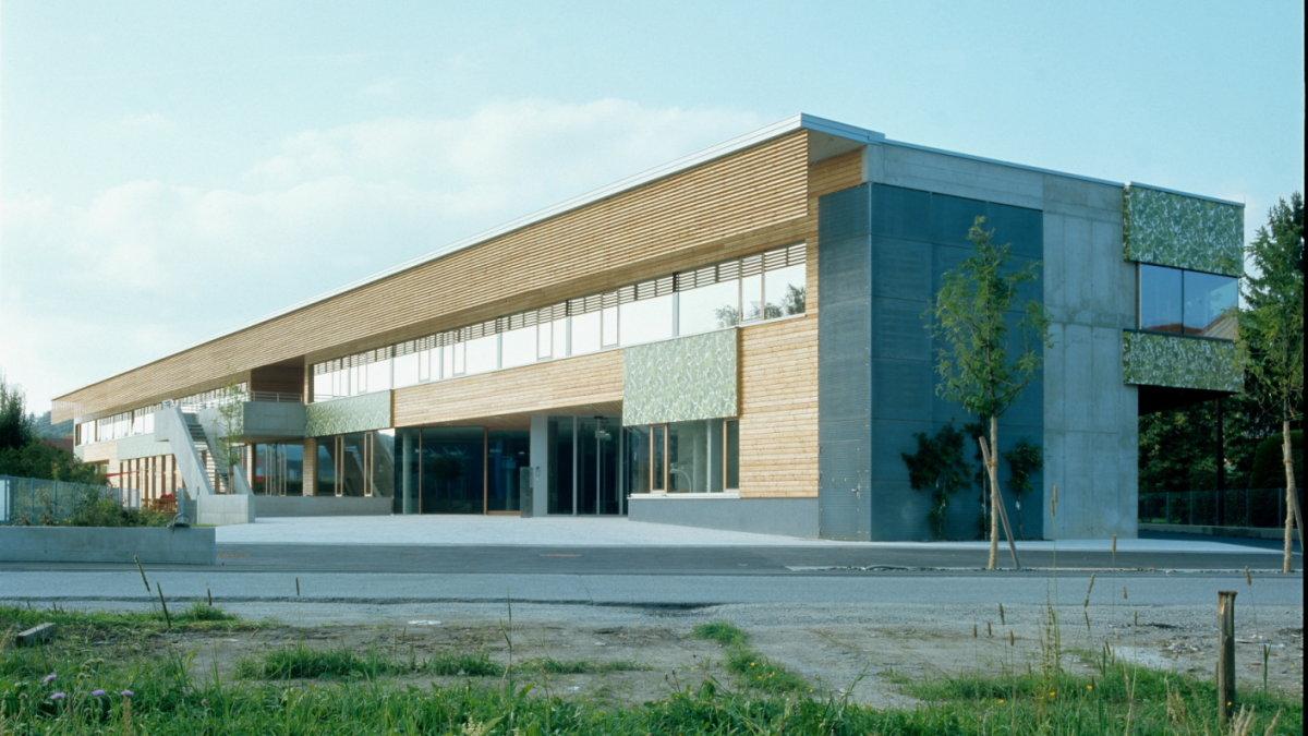 Die Eltern der Kinder hält es, so wie die Angehörigen der Pflegepatienten, aus mehreren Gründen auf dem Gelände. So gibt es hier auch einen Zahnarzt, eine Kinderärztin und einen Friseur. Es herrscht also reges, dörfliches Treiben rund um das „Haus der Generationen“. Auch die Architektur entspricht diesem Anspruch auf Durchmischung: Die Raumfolgen sind fließend und transparent zu den öffentlichen Bereichen hin geöffnet. Der Nutzung entspricht auch die Materialwahl: Holz schafft in den Außenbereichen Behaglichkeit und die mit Blättern bedruckten Fassadenplatten greifen den Baumbestand der Umgebung auf.